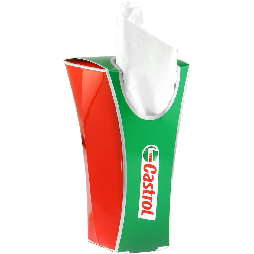 Lommetørkleboks til bilen. Boksen er laget av papp og inneholder 50 stk. lommetørklær. Lommetørklærne har to lag og er produsert av cellulose. Hele pappboksen trykkes etter dine egne ønsker.