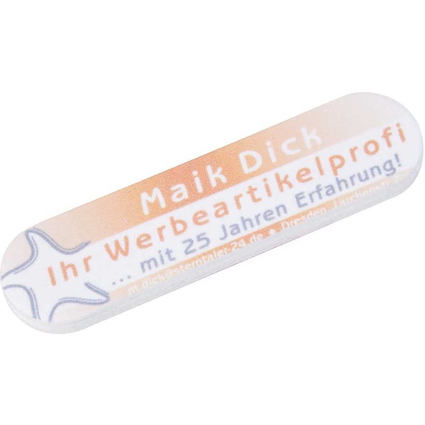 Liten neglefil i salongkvalitet. Neglefilen er i utgangspunktet hvit, og trykket gjøres på hele den ene siden. Kjernen er laget av plast og utsiden er laget av grus. Vær oppmerksom på at plastfutteralet på detaljbildet er et tilbehør (ta kontakt for prisopplysninger).