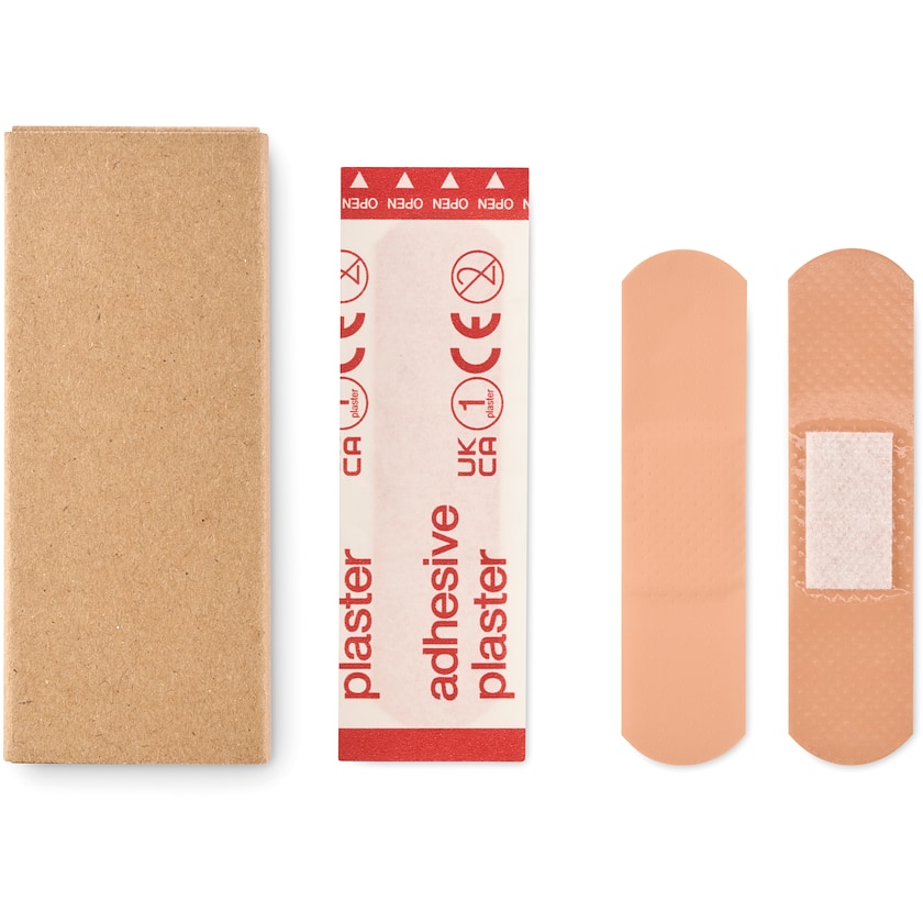 15 stk plaster i eske av naturfarget, resirkulert papir. Trykket gjøres på esken.