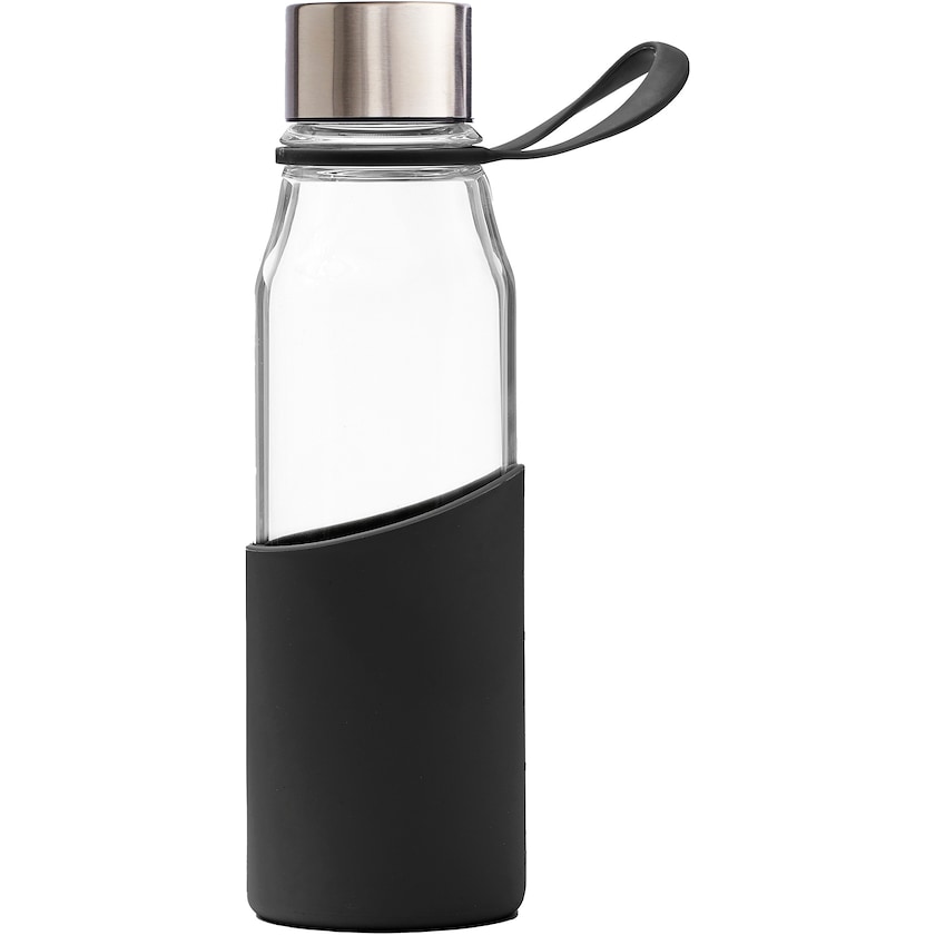 Vakker glassflaske med bunn av silikon. Glasset er av typen borosilikatglass som er veldig solid. Silikonbunnen på flasken gir ytterligere støtsikkerhet og et utmerket grep. Tåler oppvaskmaskin.