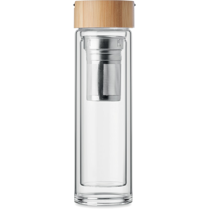 Drikkeflaske med trykk av borosilikatglass med teinfuser. Borosilikatglasset gjør drikkeflasken veldig solid. Lokket er av bambus. Flasken har doble vegger, noe som gjør at varm drikke holdes varm lenge.