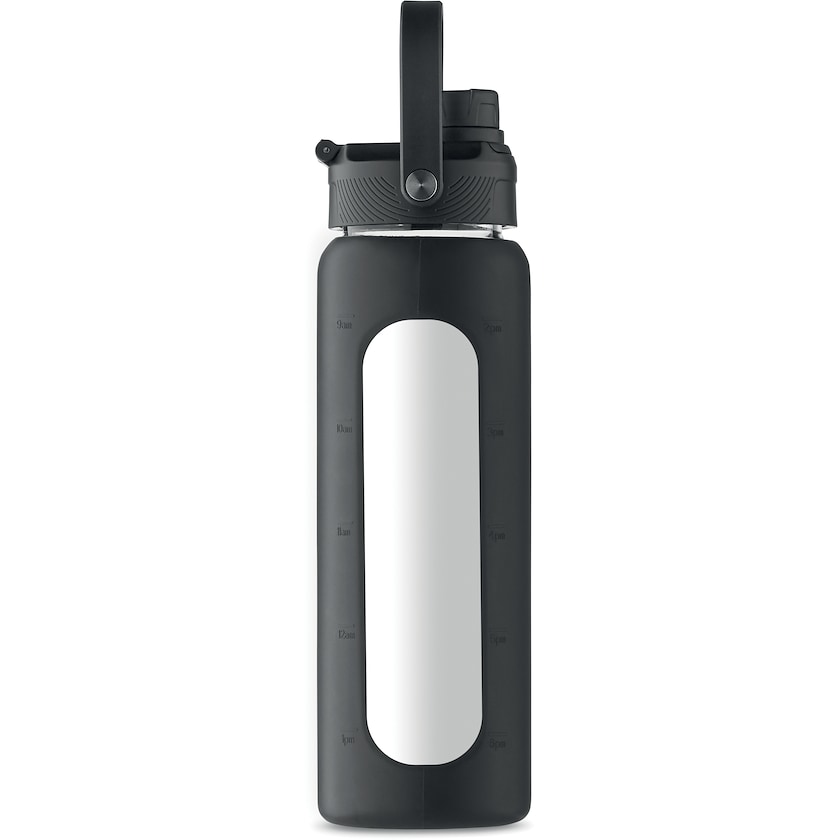 Påkostet drikkeflaske av solid borosilikatglass og silikon. Lekkasjesikker. Lokket har et bærehåndtak.