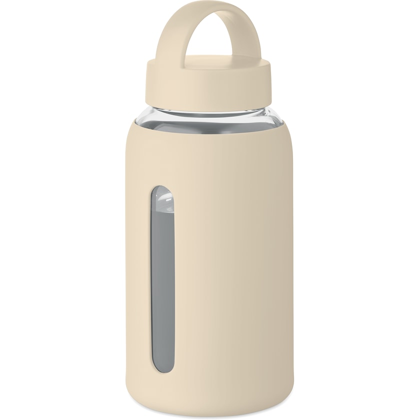 Drikkeflaske av glass med beskyttende silikondeksel. Lokket er utstyrt med et håndtak.