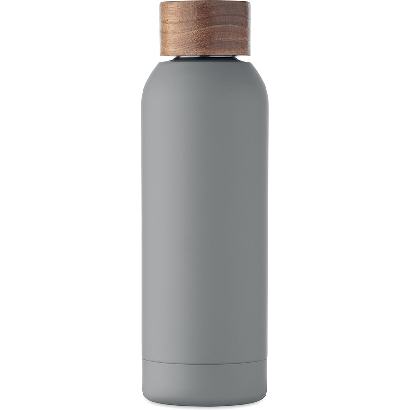 Stilren drikkeflaske av resirkulert stål med trelokk Flasken er laget av 90% resirkulert, rustfritt stål og 10% rustfritt stål. Utsiden har gummifinish. Lokket er laget av akasietre. Drikkeflasken har enkle vegger, noe som gjør at det kan være varmeoverføring fra varme drikker.