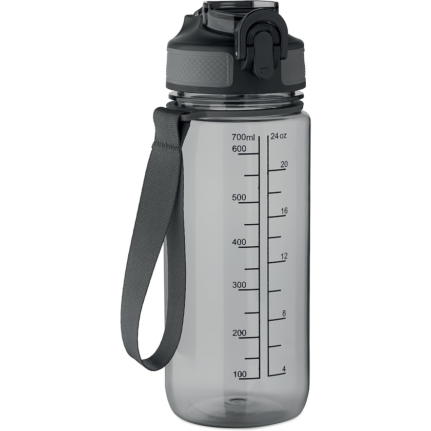 Miljøvennlig drikkeflaske med forhåndstrykte volummerking. Lokket kan åpnes med én hånd og er lekkasjesikker.