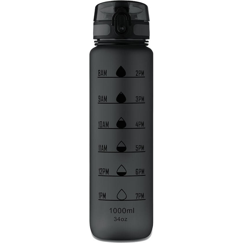 Drikkeflaske av RPET med tidsmarkeringer. Lokket er utstyrt med sikkerhetslås og kan åpnes med én hånd. Lekkasjesikker.