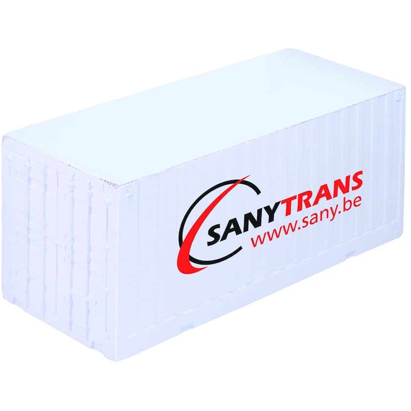 Stressball med trykk formet som en container. En stilig form som passer spesielt godt til logistikkbedrifter. Velg mellom flere ulike farger.