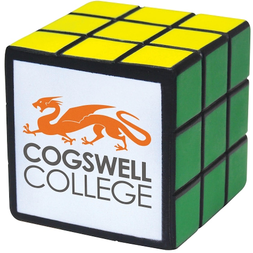 Stressball formet som en kube. Stressballen har en hvit side som påføres trykk. Trykket holder topp kvalitet.