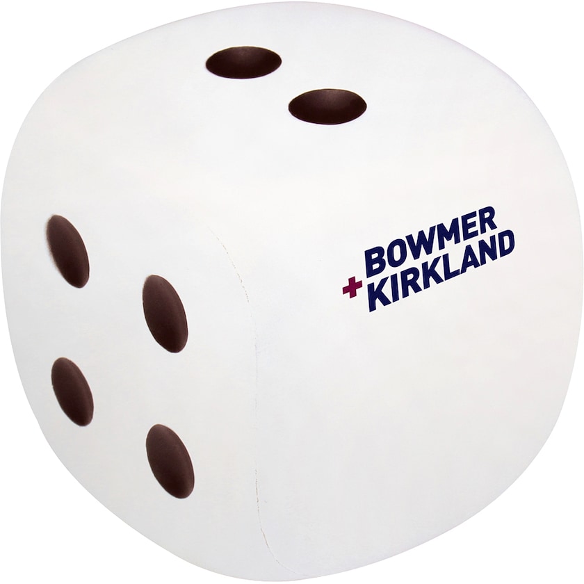 Stressball designet som en terning. Trykket gjøres der 1-tallet vanligvis står (dvs. at ettallet mangler). Trykker holder topp kvalitet.