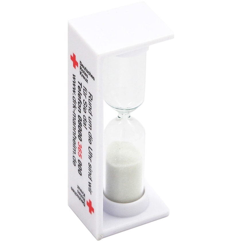 Hold styr på tannbørstingen! Lite timeglass med trykk. Timeglasset renner igjennom på ca 3 minutter. Kan trykkes med maks to farger.