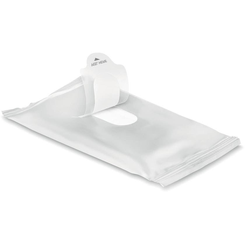 Våtserviettpakke med 10 stk våtservietter. Merking skjer på en digitaltrykket etikett.