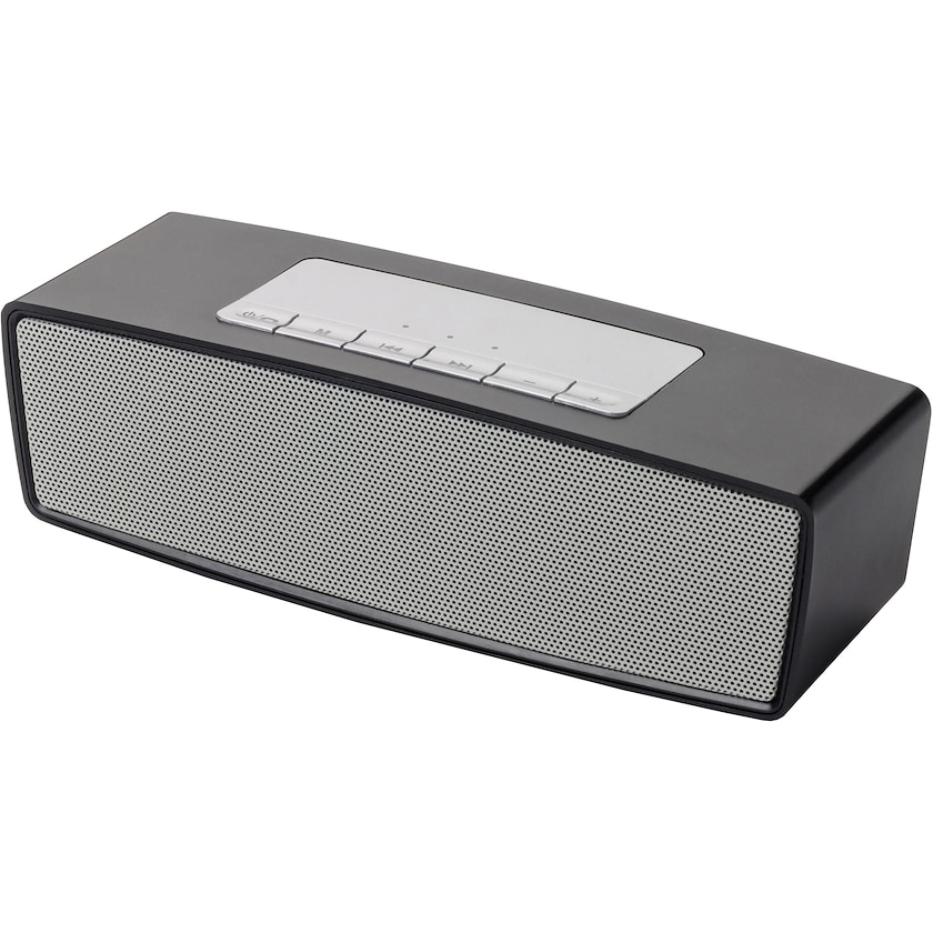 Påkostet bluetooth-høyttaler i elegant design. Høyttaleren kan kobles til på flere måter. Foruten tilkobling via bluetooth kan tilkobling skje via AUX, mikro-SD-kort og USB-minne. Høyttaleren har også en innebygget radio og kan benyttes som høyttalertelefon. Produktet er CE-merket. Trykket gjøres med digitaltrykk på høyttalergitteret.