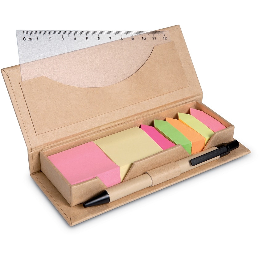 Sett med indexlapper med notatblokk i to ulike farger og indexlapper i fem farger. Settet inneholder også en transparent 12 linjal og en kulepenn i papp.