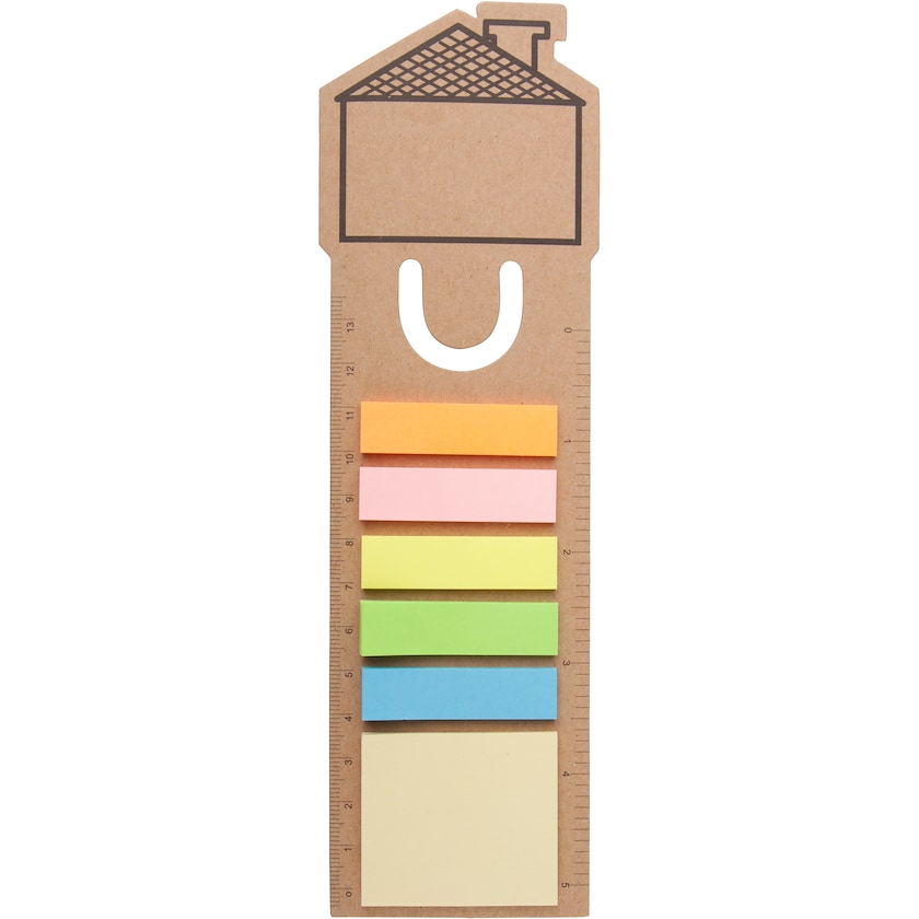 Merkelapper med papirlinjal og husmotiv. Dette lekne produktet inneholder både fargeglade merkelapper og notisbok. Perfekt for alle i husbransjen!
