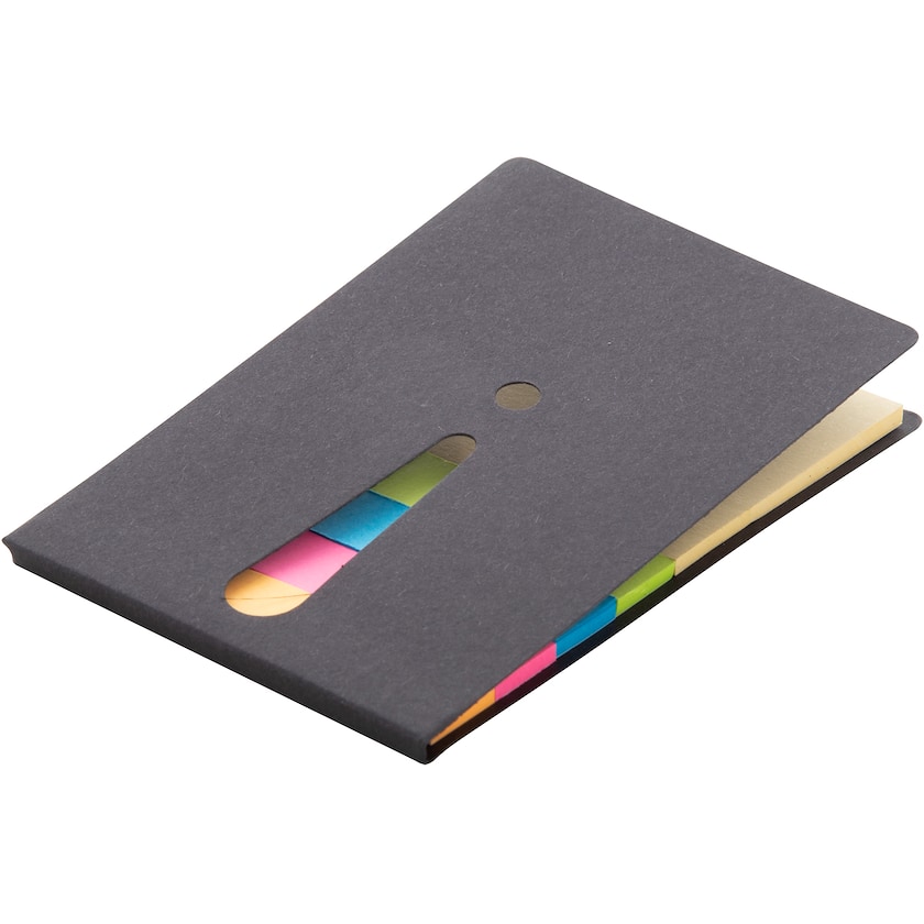 Sett med fargeglade indexlapper og notatblokk. Settet inneholder 100 stk merkelapper i fire ulike farger, og 25 stk gule notisark. På fremsiden er det et utstanset utropstegn.
