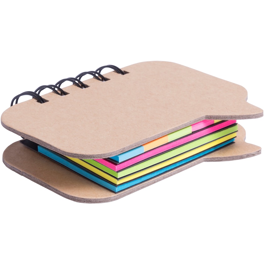 Merkelapper med omslag formet som en prateboble. Settet inneholder både indexlapper og selvheftende notatblokk. Trykket gjøres på omslaget.