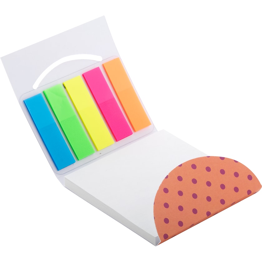 Sammenleggbart sett med indexlapper og skriveblokk. Det er totalt 100 stk indexlapper fordelt på fem forskjellige farger. Alle indexlappene er 44 x 12 mm. Skriveblokken er 75 x75 mm og består av 50 sider med lim på den ene siden.