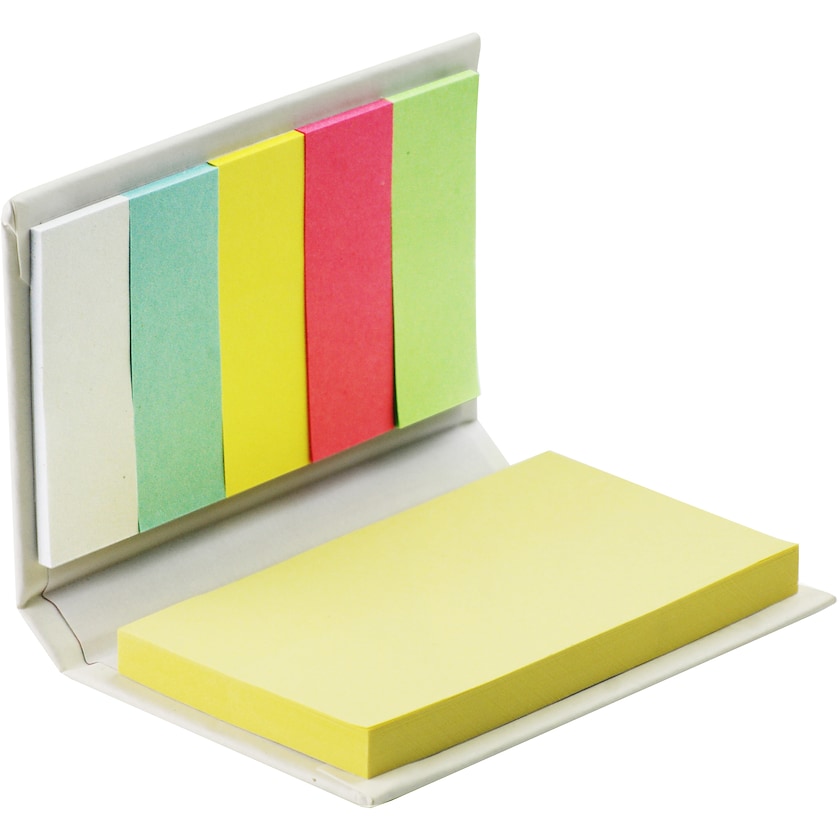 Praktisk sett med notatblokk og etikettfaner i forskjellige farger.