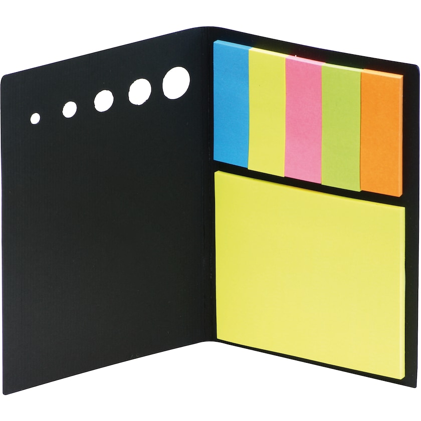 Sett med notatblokk og fem etikettfaner i forskjellige farger. Trygget gjøres på forsiden av omslaget.