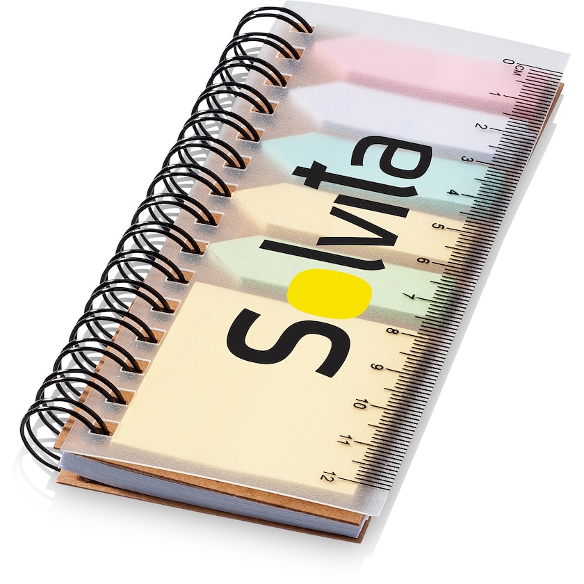 Spiralbundet merkelappsett med skriveblokk Spirale har 25 merkelapper i fem ulike farger, selvheftende notatblokk på 25 ark og 40 hvite, linjerte ark. Plastomslaget fungerer også som linjal.