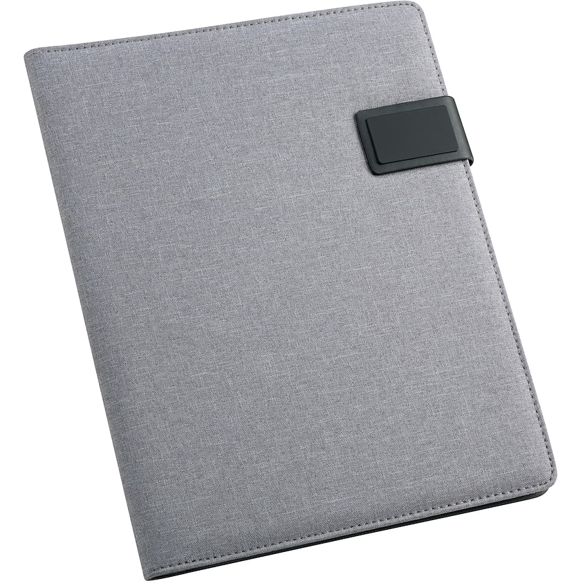 Konferansemappe i A4-størrelse med omslag av stoff og kunstlær. Mappen holdes lukket med en magnetlås. Innvendig finnes det 20 linjerte ark. På fremsiden er det en metallplate med gummiert overflate der lasergraveringen skjer. Penn inngår ikke.