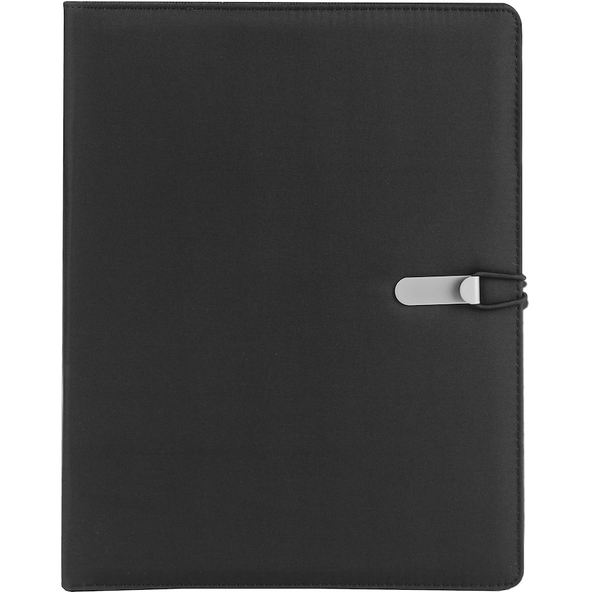 Moderne konferansemappe i A4-størrelse med en stor og to mindre lommer. Mappen har to USB-stasjoner, og kan lukkes på en smart måte med en løkke rundt en metallkrok.