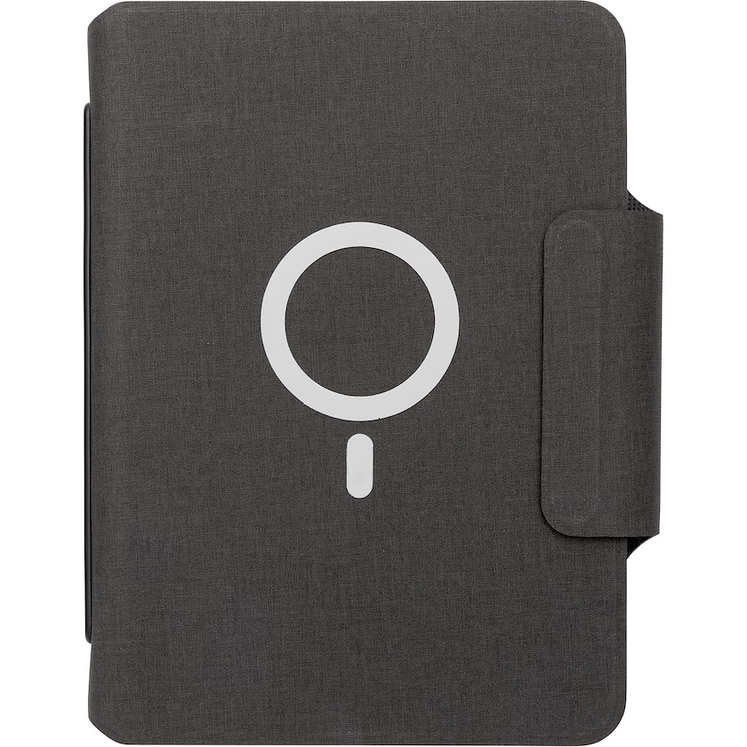 Konferansemappe med innebygget powerbank på 8000 mAh med trådløs lading. På innsiden er det en A4-blokk med 64 linjerte ark. Registrert design. Leveres i stilig gaveeske.