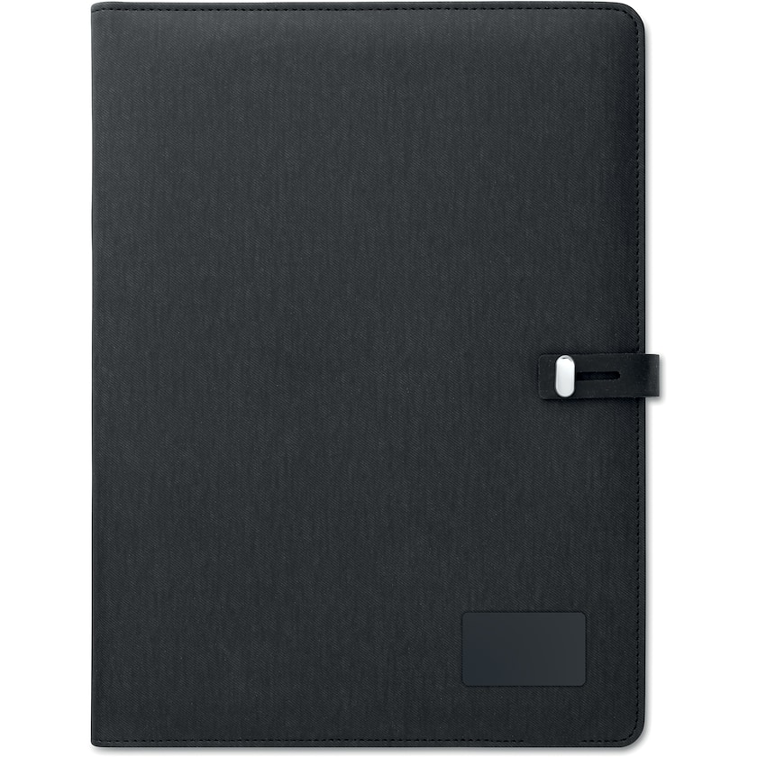 Konferansemappe med innebygd powerbank. Konferansemappen har en skriveblokk med 20 linjerte ark. Powerbanken har en kapasitet på 4000 mAh. Lading kan enten gjøres trådløst eller via vanlig USB eller USB-C. Lasergraveringen gjøres på den svarte metallplaten.