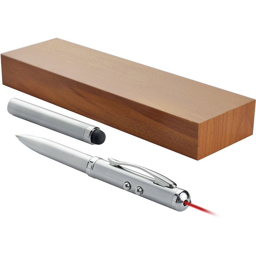 Laserpekeren har kulepenn, touchfunksjon og lommelykt i elegant treeske. Merkingen skjer med lasergravering på laserpekeren. Laserpekeren har advarselsmerking i samsvar EU-direktivet 2006/25/EU