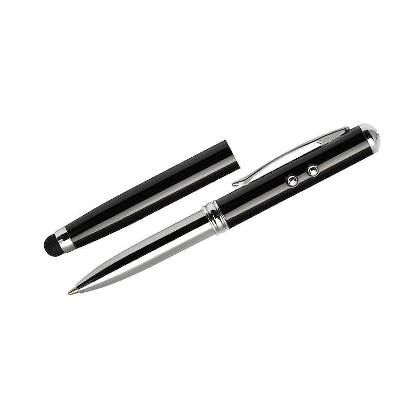Laserpeker med berøringsfunksjon, kulepenn og lommelykt.