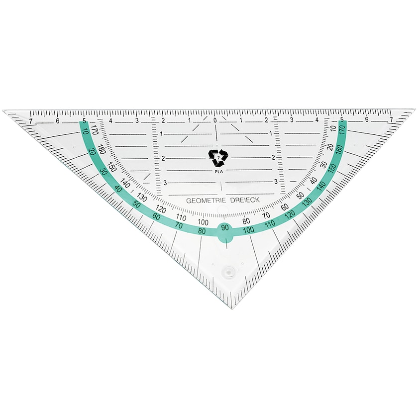 Miljøvennlig trekantlinjal. Linjalen er laget av bioplast, den er på 14 cm og har en farget gradskive på 180° til vinkelmåling.