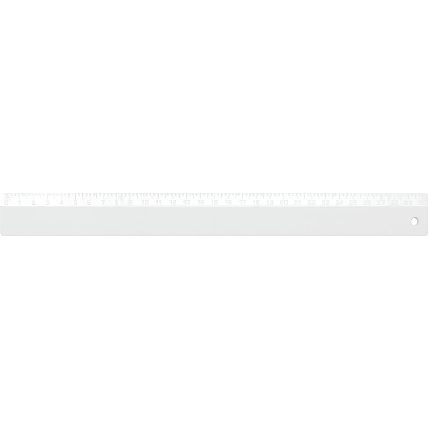 Hvit linjal med eget trykk, lengde 30 cm. Tallene er preget inn i plasten og blir derfor ikke slitt bort.