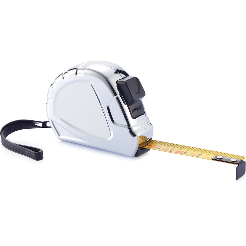 5-meters målebånd med i elegant krom. Selve målebåndet er gult og i metall som oppfyller kravene til ECII. På baksiden finnes en belteklips.