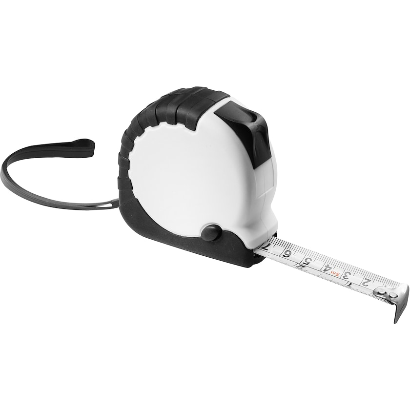 Hvitt målebånd med svarte detaljer av gummi, 5 meter. Det er en belteklips i metall på baksiden, slik at målebåndet kan festes i beltet.