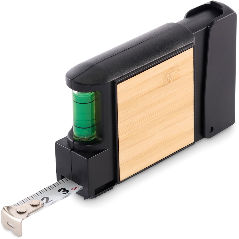 Målebånd med vater og bitssett. Målebåndet er laget av metall og dekselet er laget av ABS og bambus.