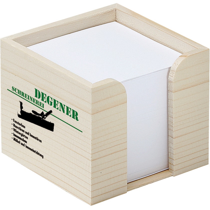 Notatblokkube i rustikk treboks med stor trykkflate. Trykk er ikke mulig på arkene.