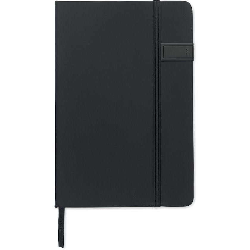 Skrivebok med et 16 GB USB-minne. Skriveboken har et hardt omslag og innmat består av 80 linjerte sider av resirkulert miljømerket papir. Omslaget er delvis laget av resirkulert materiale.