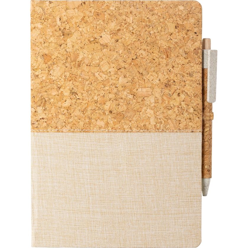 Skrivebok av bomull og kork. En penn laget av kork, samt en miljøvennlig miks av hvete-halm og plast følger med. Trykkprisen er for trykk på enten skriveboken eller pennen.