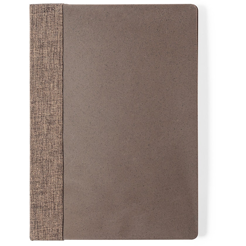 Miljøvennlig skrivebok med omslag av kaffefiber. Innmaten består av 100 linjerte sider. På baksiden av omslaget er det forhåndstrykket informasjon om at den er laget av kaffefiber.
