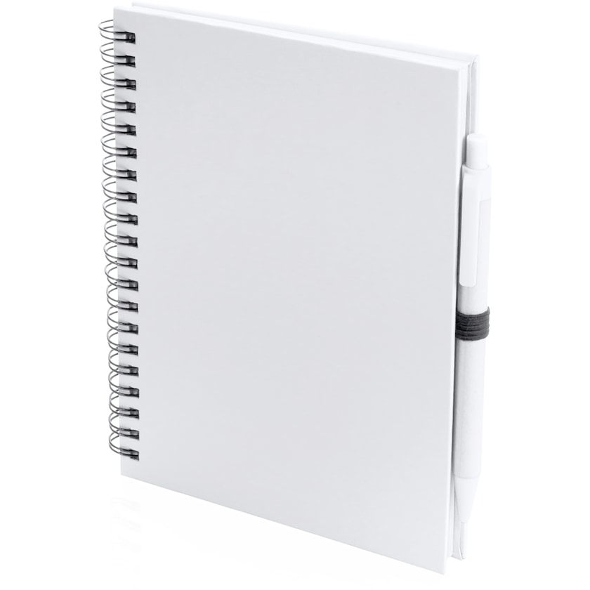 Miljøvennlig spiralbok i A5-format med penn i matchende farge. Spiralboken har 70 ulinjerte ark av resirkulert papir og et omslag av kraftig kartong. Trykk kan gjøres både på skriveboken og kulepennen.