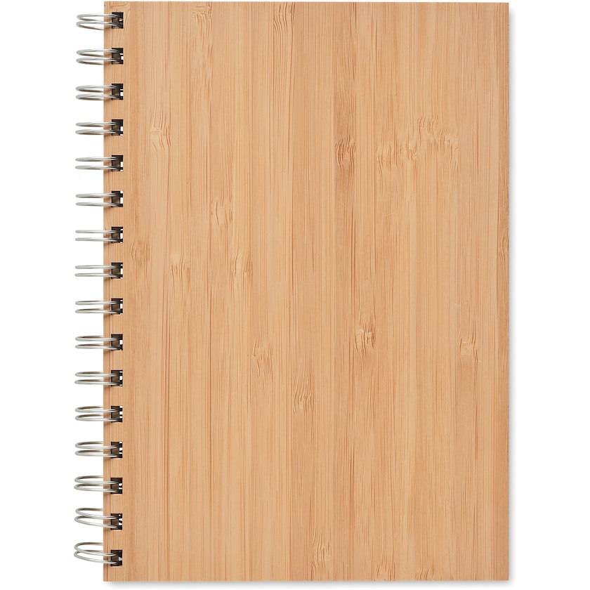 Spiralbok med omslag av bambus. Innmaten består av 70 linjerte sider. Merking gjøres med trykk eller lasergravering.