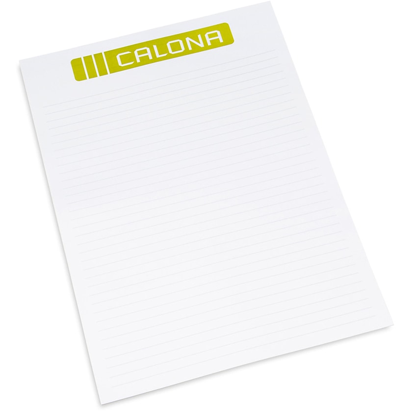 Limt skriveblokk i A4-format. Velg mellom 10, 20 eller 30 sider. Baksiden er av kartong. Sidene trykkes helt etter dine egne ønsker. Trykk i maks fire farger gjøres i henhold til pantoneskalaen og deretter i CMYK.
