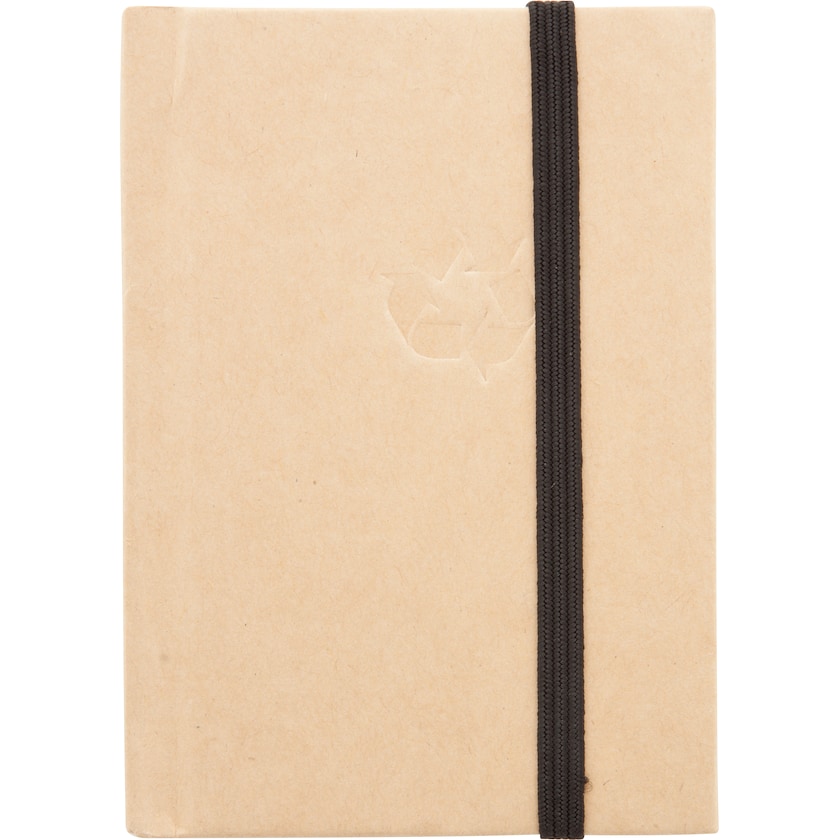 Miljøvennlig skrivebok som er laget av resirkulert materiale. På framsiden finnes det et preget gjenvinningssymbol.