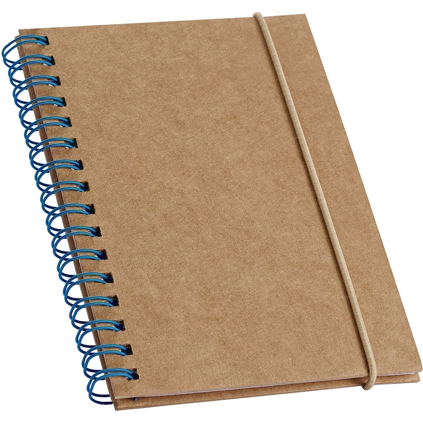 Spiralbok med farget spiral og omslag av naturfarget kartong. Spiralbok Poet har 60 linjerte ark av resirkulert papir.