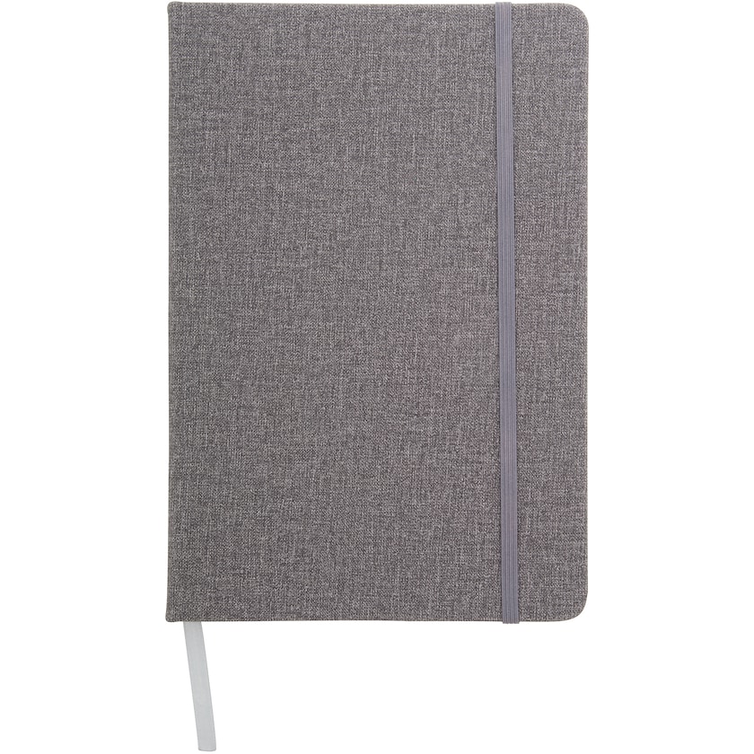 Skrivebok i A5-størrelse med omslag av tekstil. Skriveboken har 80 linjerte ark og omslaget har et elastisk bånd som holder boken lukket når den ikke er i bruk. Trykk kan skje i maksimalt to farger.