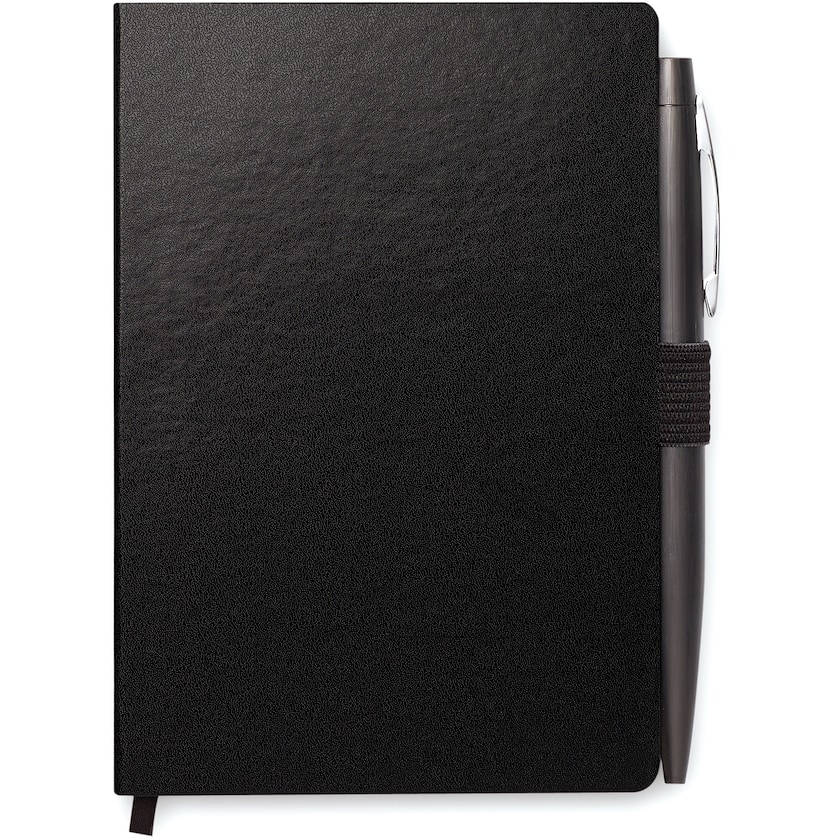 Skrivebok i A6-størrelse med penn. Omslaget på skriveboken er av kunstlær. Innmaten består av 72 linjerte sider. Pennen er laget av metall og har blått blekk. Trykkprisen gjenspeiler trykk på enten skriveboken eller på pennen.