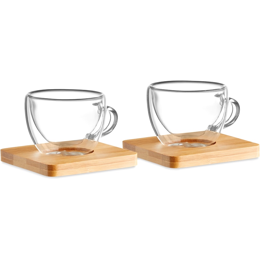 Sett med to espressoglass og glassbrikker av bambus. Hvert glass rommer 9 cl. Leveres i en stilig gaveeske. Trykkprisen refererer til trykk enten på papirbåndet rundt gaveesken eller på én av glassbrikkene.