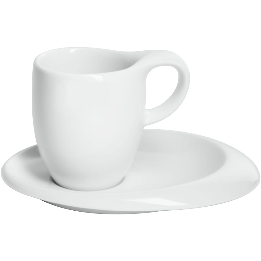 Luksuriøst sett med espressokopp og fat. Settet er laget av blankpolert porselen. Både koppen og fatet har en rund, attraktiv form. Takket være at fatet er ekstra stort, er det også plass til en kjeks eller en sjokoladebit.