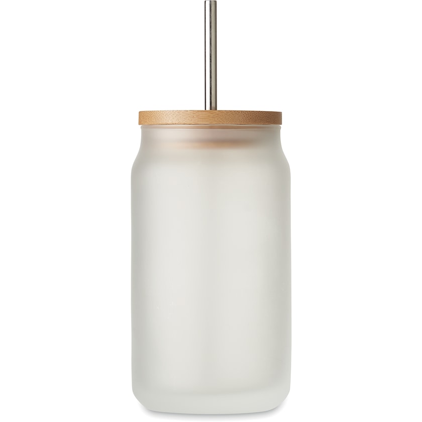 Glasskrus med trykk over hele overflaten. Lokket er laget av bambus og sugerøret av rustfritt stål.