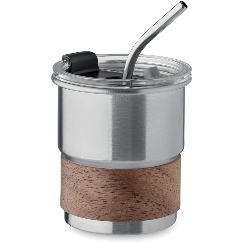 Metallkrus med sugerør og grep av akasietre. Donau har enkelvegg og er laget av 90% resirkulert, rustfritt stål og 10% rustfritt stål. Lekkasjesikker.
